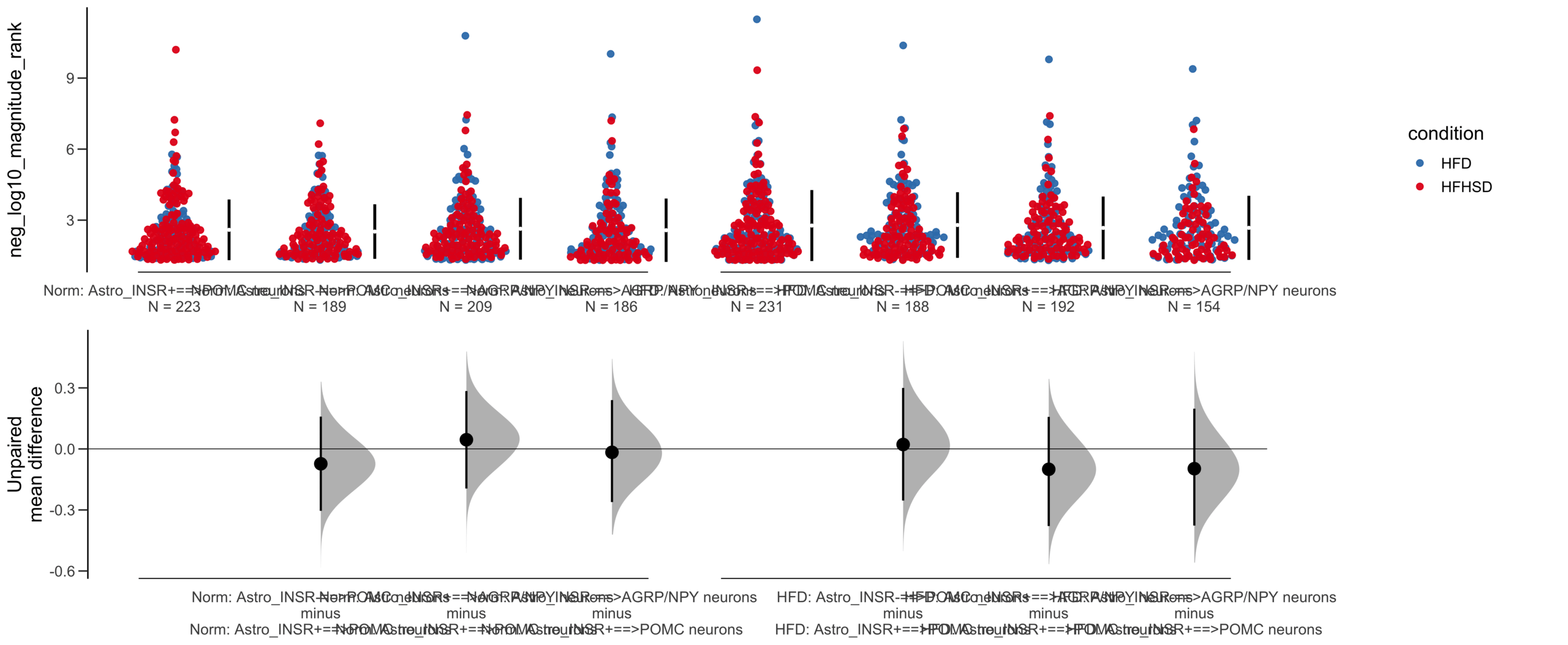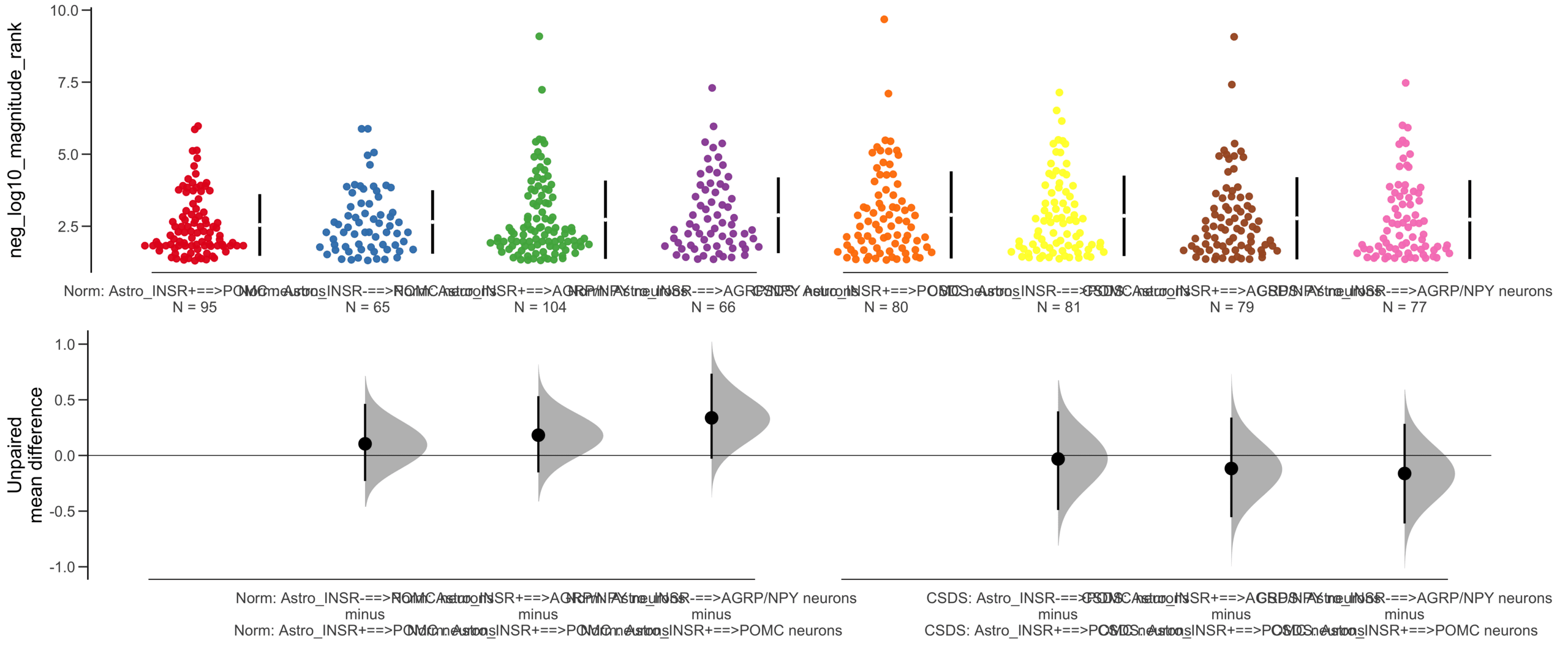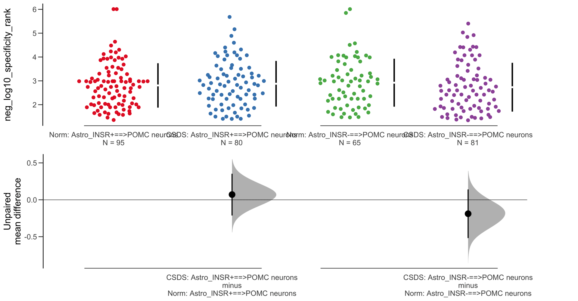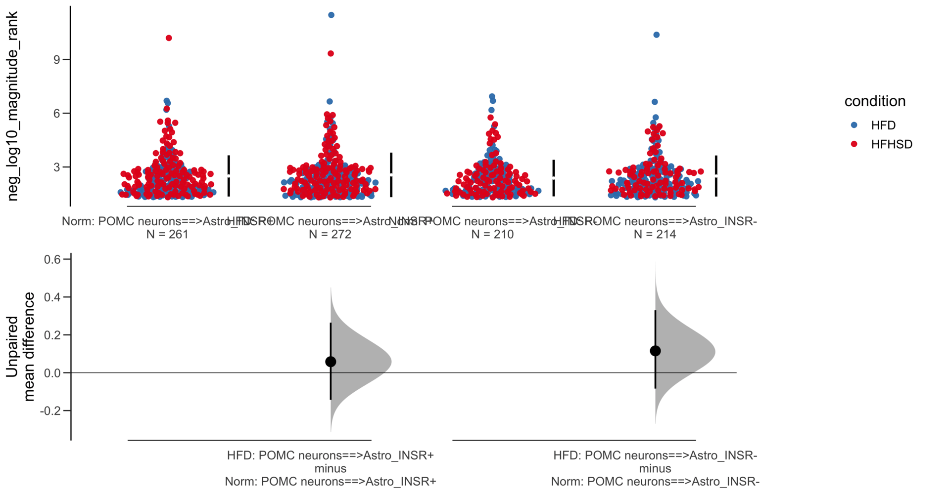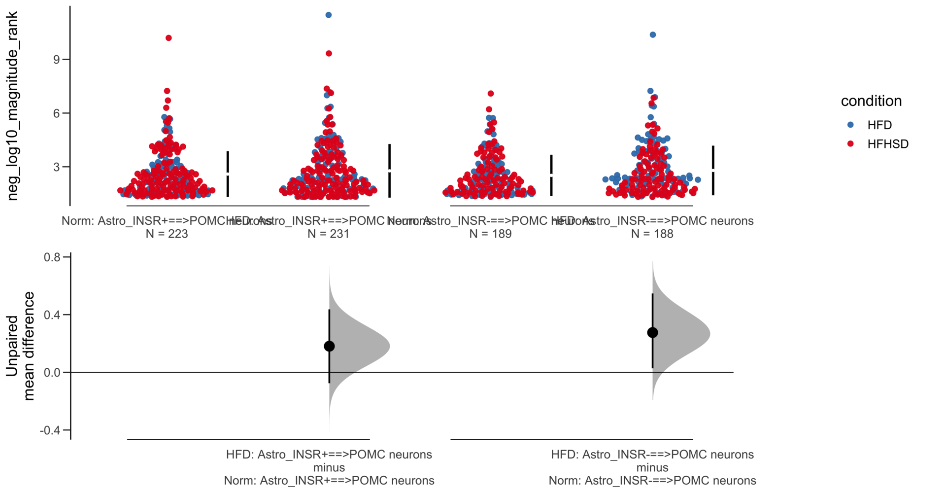 Unpaired mean difference of POMC neurons==>Astro_INSR- (n = 424) minus POMC neurons==>Astro_INSR+ (n = 533)