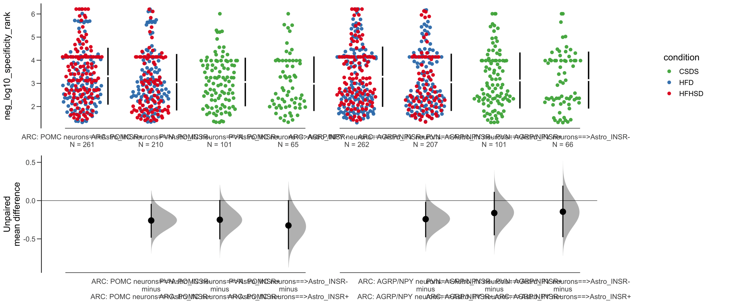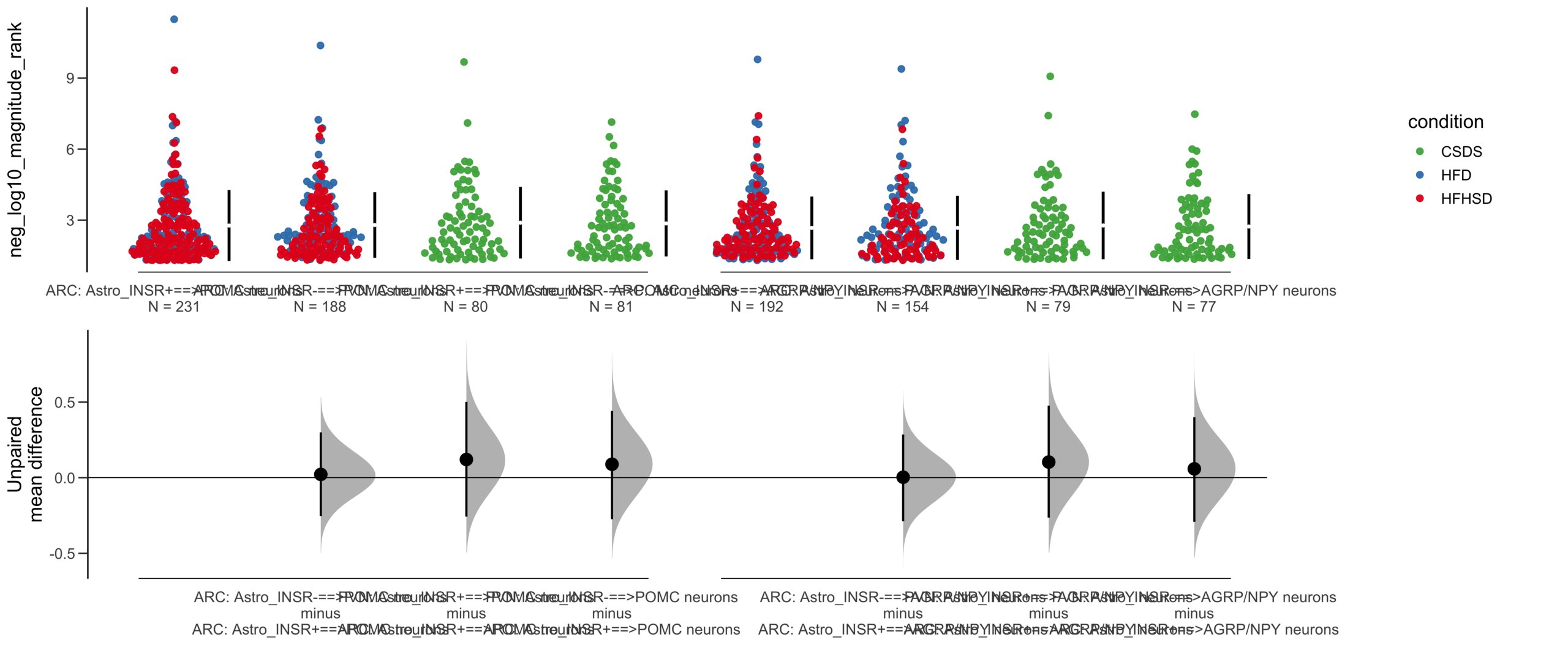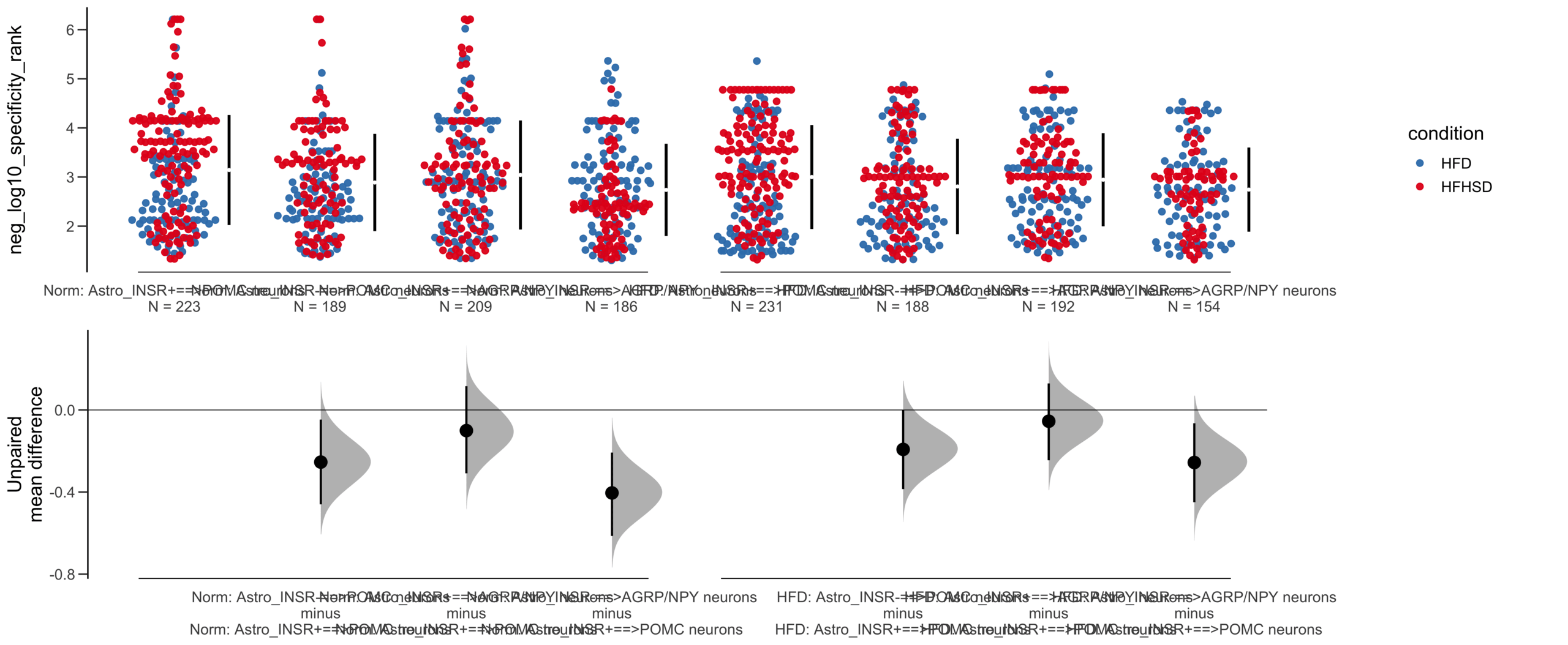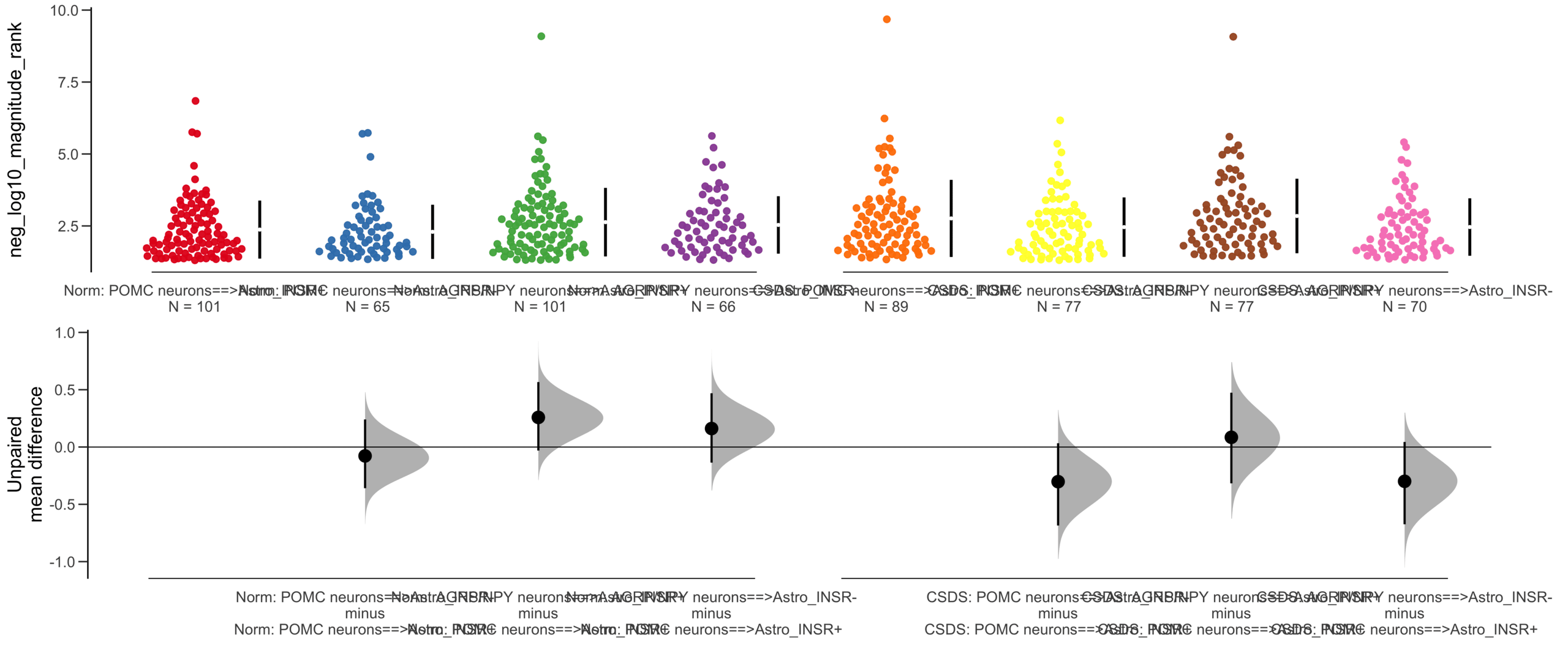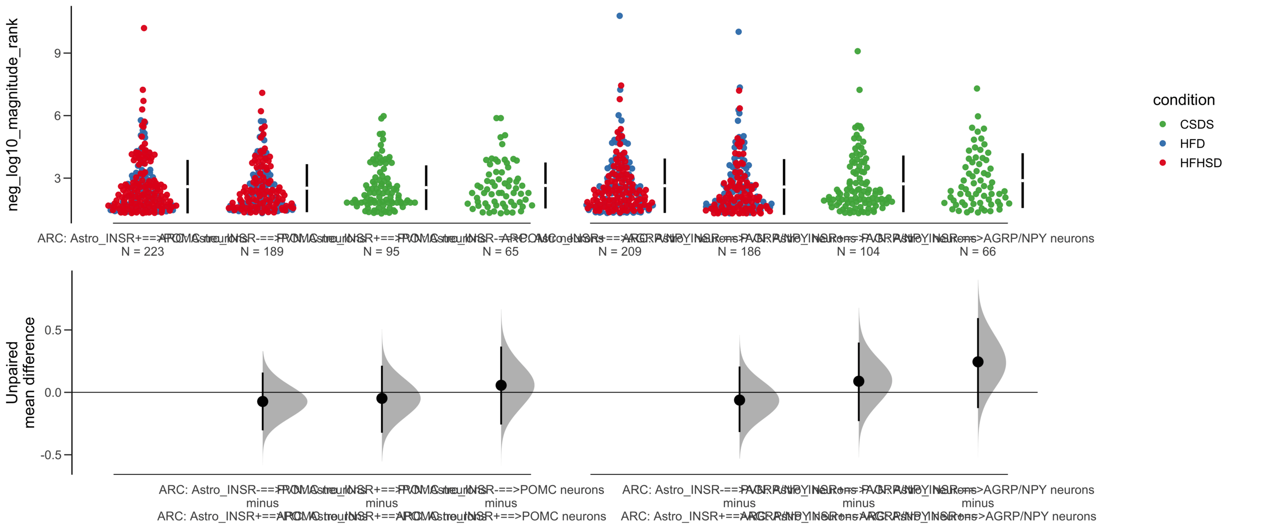 Unpaired mean difference of POMC neurons==>Astro_INSR- (n = 424) minus POMC neurons==>Astro_INSR+ (n = 533)