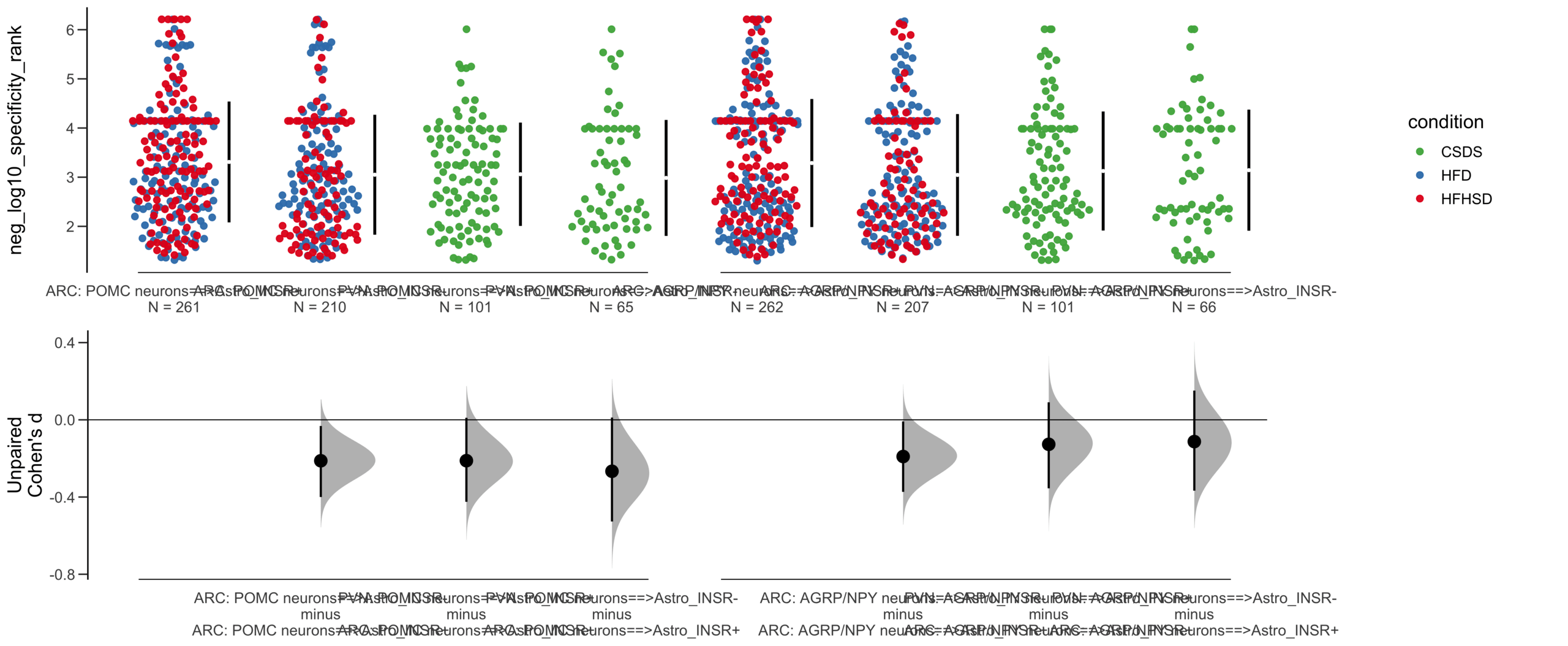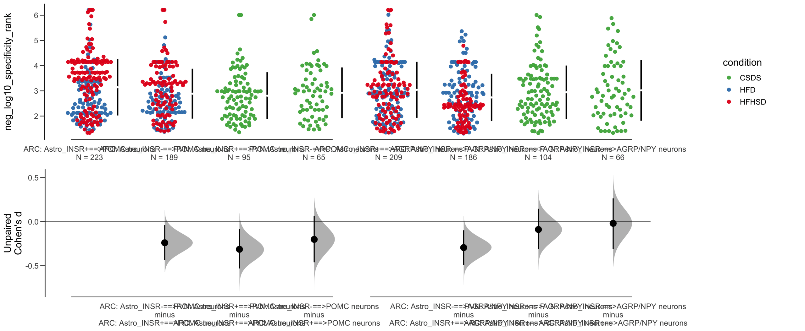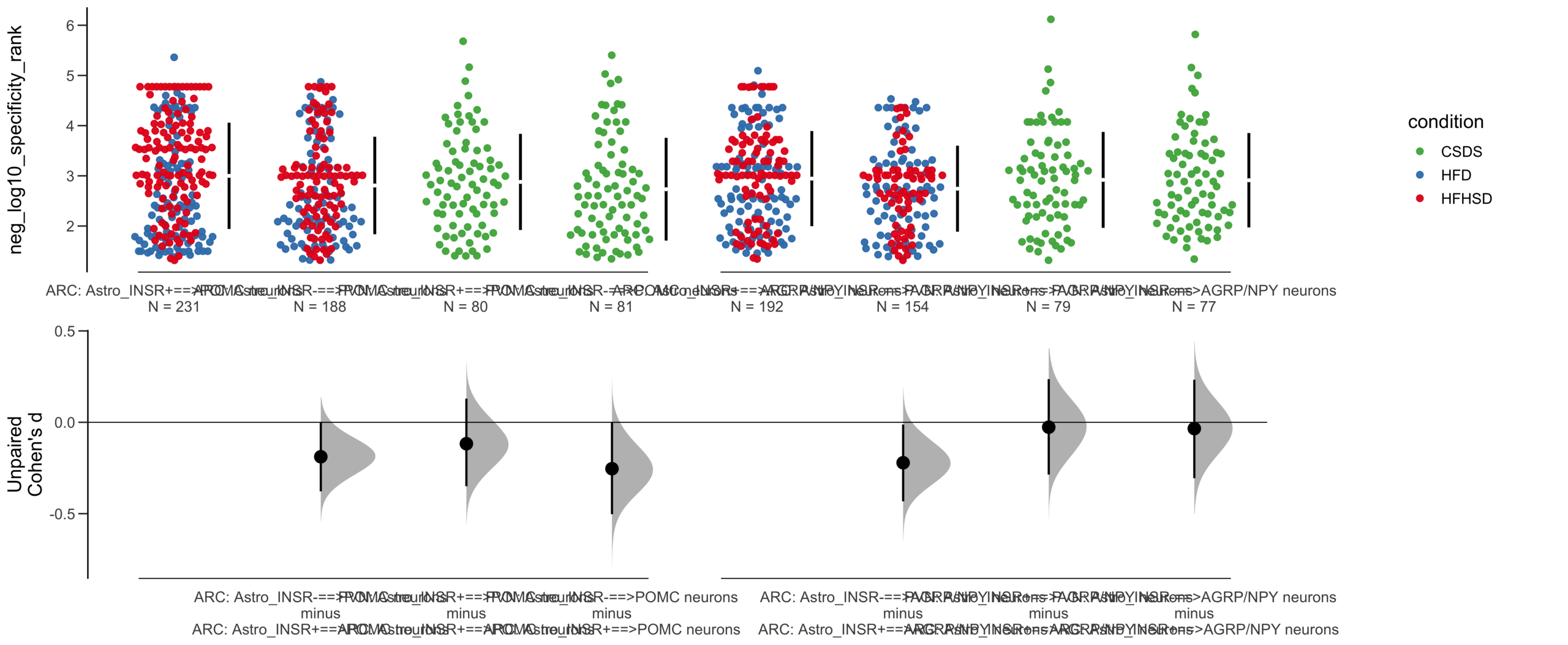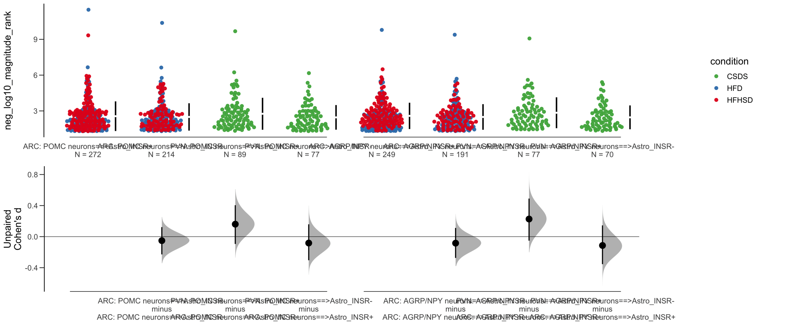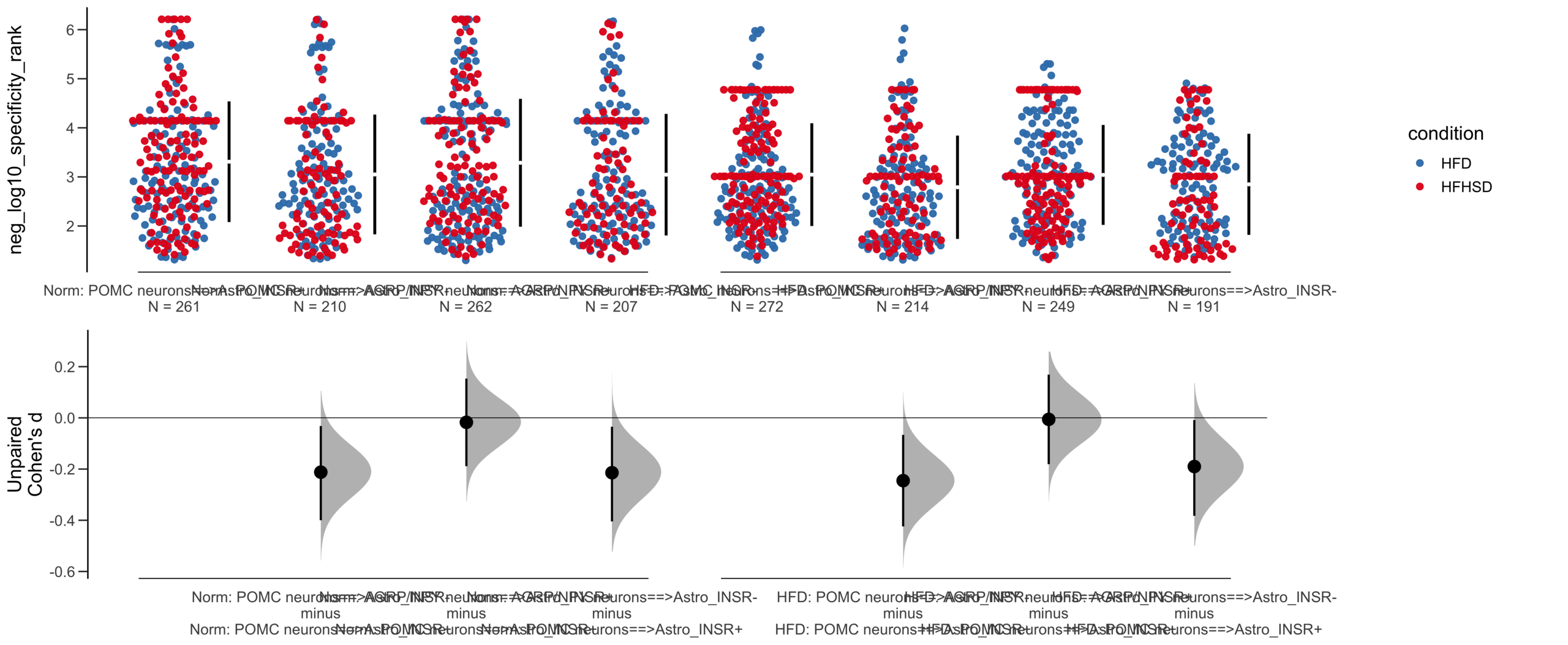 Unpaired Cohen's d of POMC neurons==>Astro_INSR- (n = 424) minus POMC neurons==>Astro_INSR+ (n = 533)