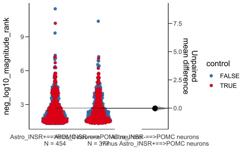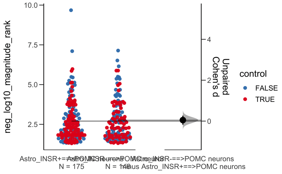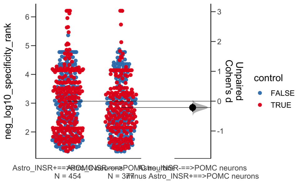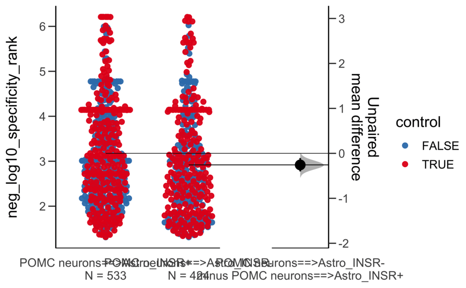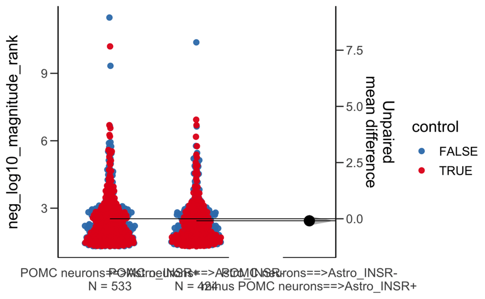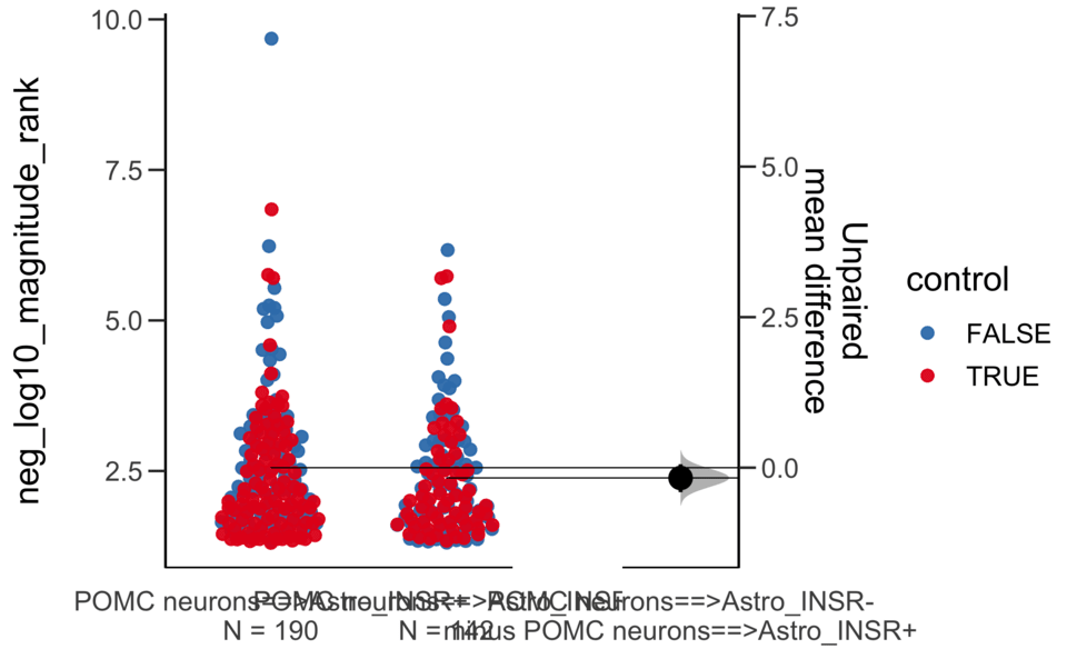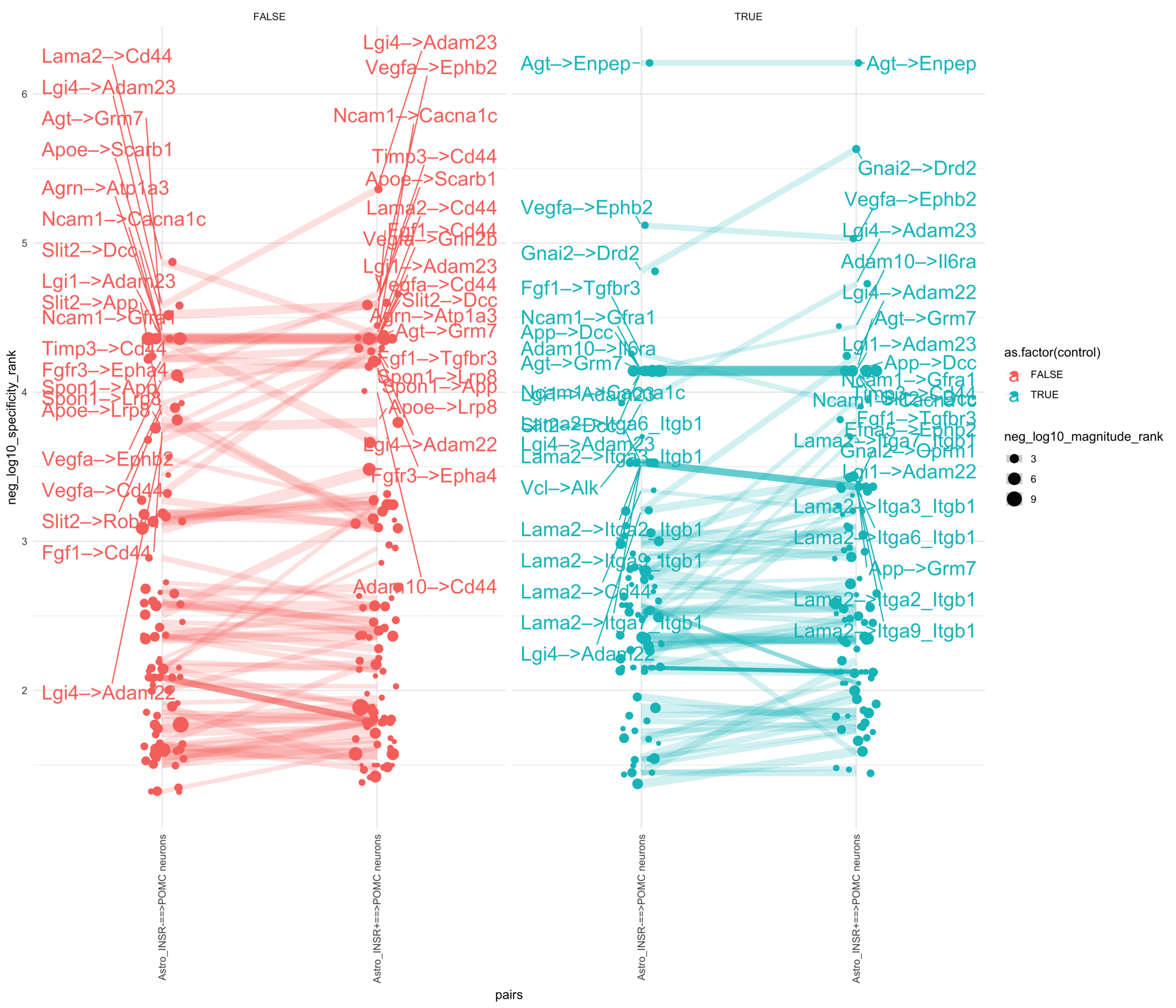 pl <-ggplot(df, aes(x = pairs, y = neg_log10_specificity_rank, color =as.factor(control), size = neg_log10_magnitude_rank)) +geom_jitter(width =0.1) +geom_line(aes(group = lr_complex), linetype ="solid", alpha =0.2) +theme_minimal() +theme(axis.text.x =element_text(angle =90, vjust =0.5, hjust =1)) +facet_wrap(~control)# Add text labels for min and max 5 values within each group using ggrepelpl <- pl +geom_text_repel(data = top_bot_10 %>%filter(pairs =="Astro_INSR+==>POMC neurons"),aes(label = ligand_complex,point.size = neg_log10_magnitude_rank ), # data point sizenudge_x =0.2, direction ="y", hjust ="left",size =6, # font size in the text labelspoint.padding =0, # additional padding around each pointmin.segment.length =0, # draw all line segmentsmax.time =5, max.iter =1e6, # stop after 1 second, or after 100,000 iterationsseed = reseed,max.overlaps =Inf,box.padding =0.5) +geom_text_repel(data = top_bot_10 %>%filter(pairs =="Astro_INSR-==>POMC neurons"),aes(label = ligand_complex,point.size = neg_log10_magnitude_rank ), # data point sizenudge_x =-.2, direction ="y", hjust ="right",size =6, # font size in the text labelspoint.padding =0, # additional padding around each pointmin.segment.length =0, # draw all line segmentsmax.time =5, max.iter =1e6, # stop after 1 second, or after 100,000 iterationsseed = reseed,max.overlaps =Inf,box.padding =0.5)print(pl)