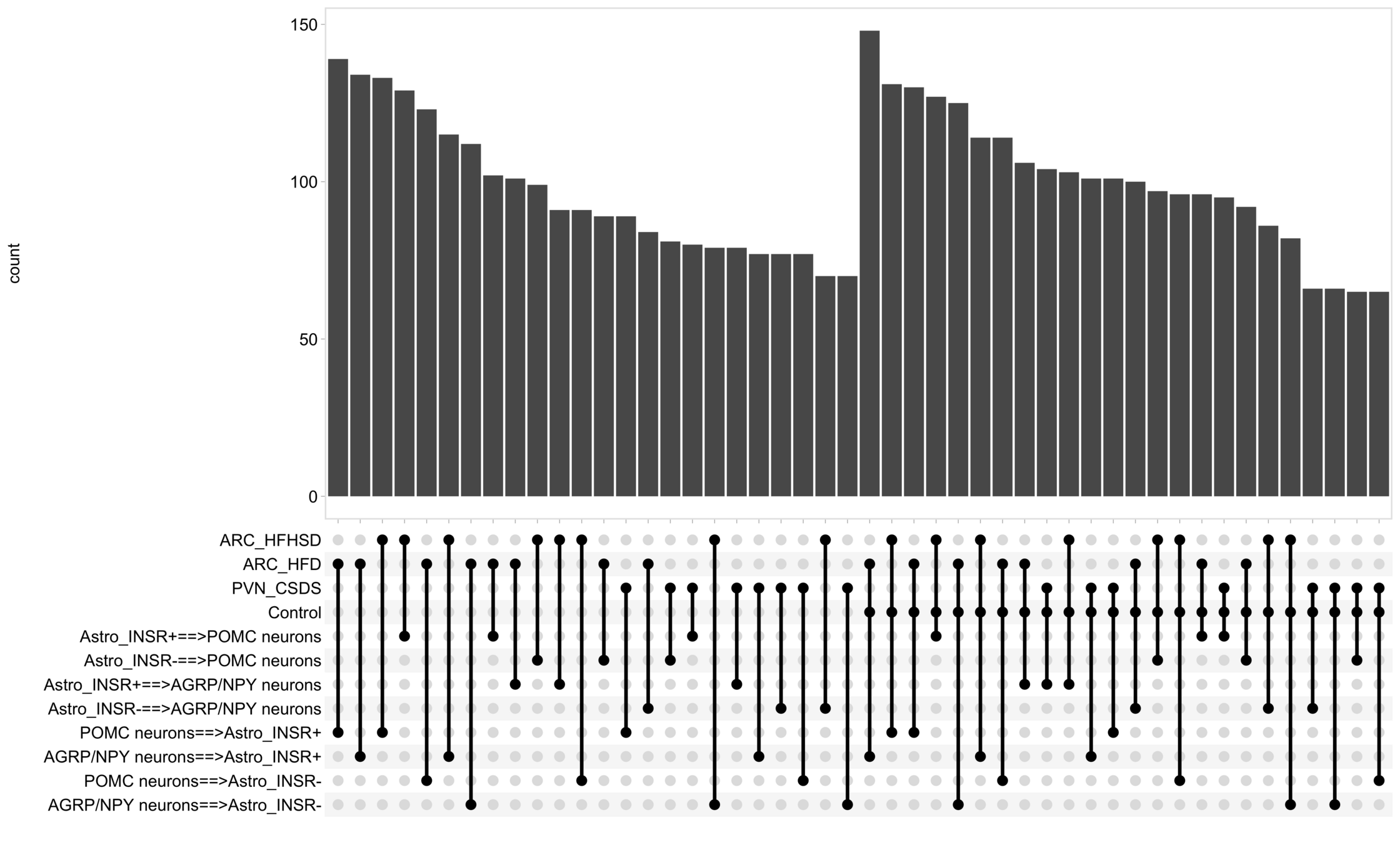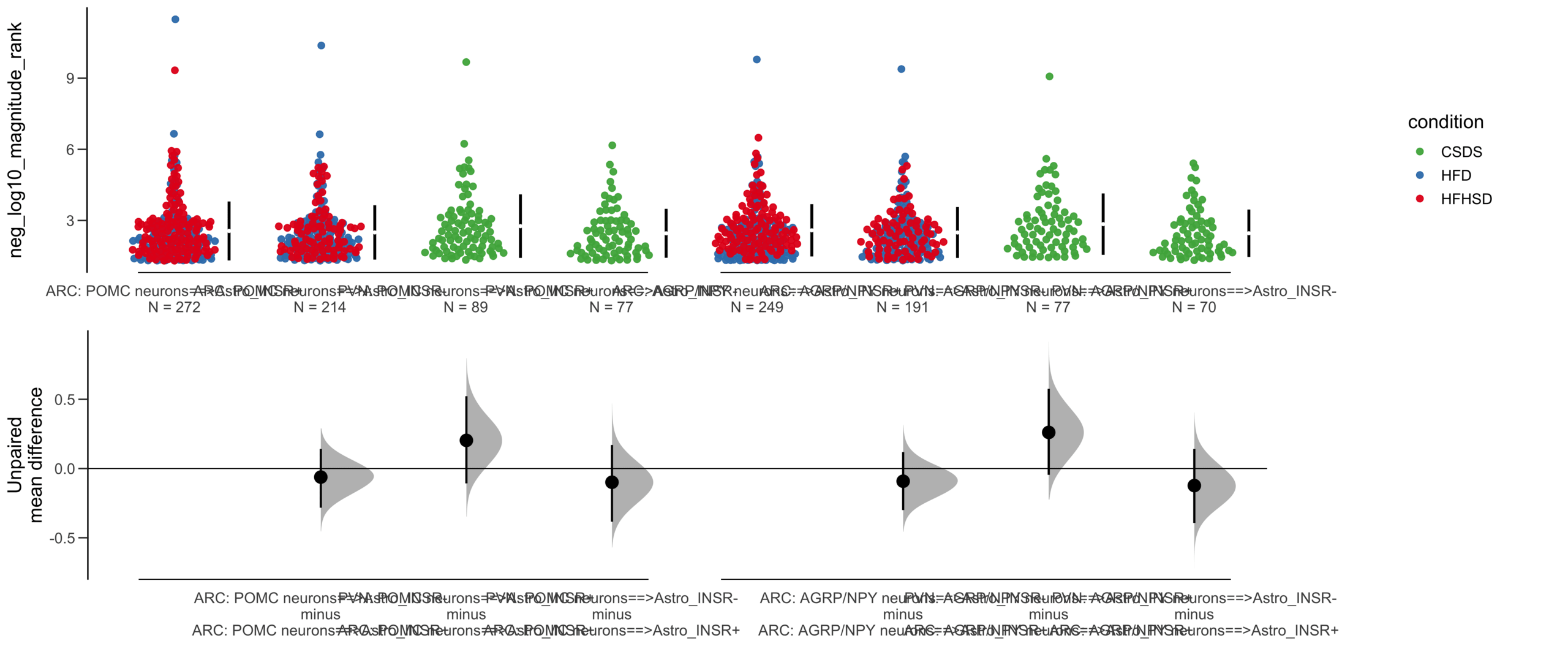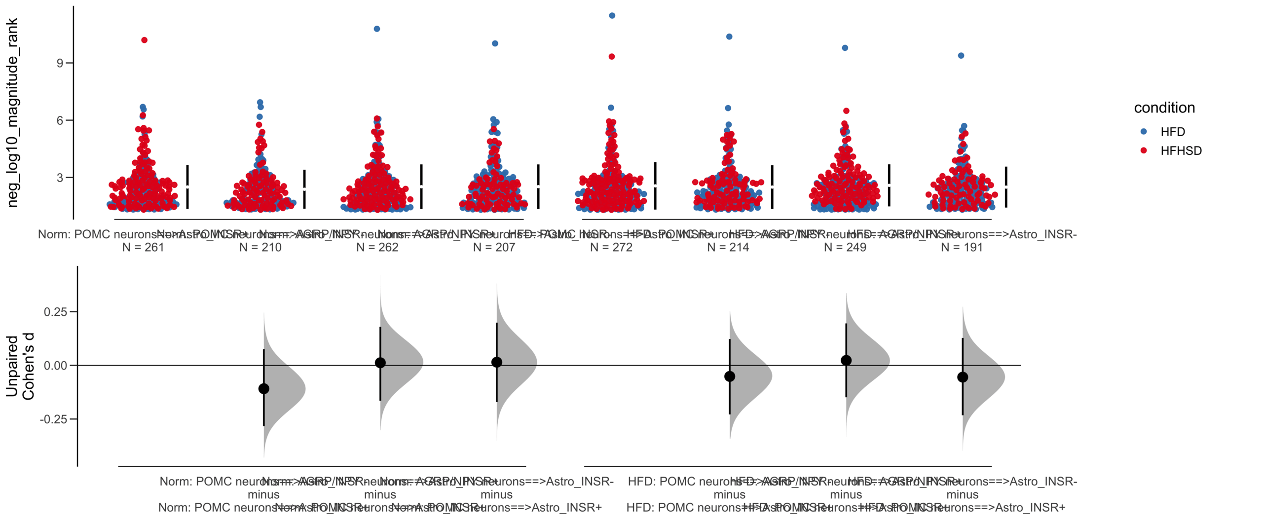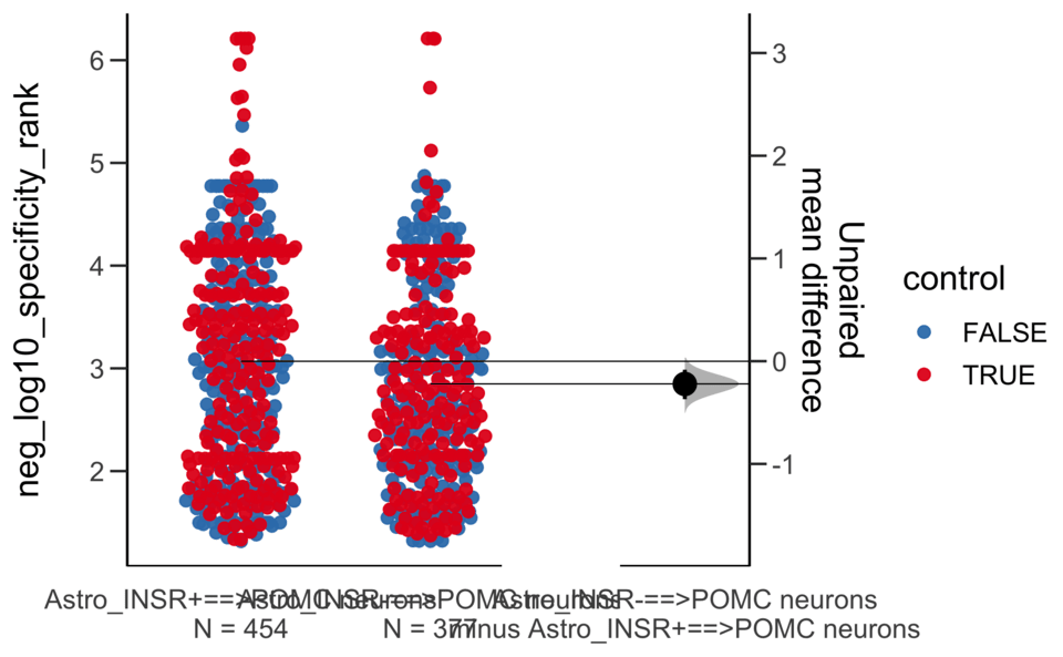 pl <-ggplot(df, aes(x = pairs, y = neg_log10_specificity_rank, color =as.factor(control), size = neg_log10_magnitude_rank)) +geom_jitter(width =0.1) +geom_line(aes(group = lr_complex), linetype ="solid", alpha =0.2) +theme_minimal() +theme(axis.text.x =element_text(angle =90, vjust =0.5, hjust =1)) +facet_wrap(~control)# Add text labels for min and max 5 values within each group using ggrepelpl <- pl +geom_text_repel(data = top_bot_10 %>%filter(pairs =="Astro_INSR+==>POMC neurons"),aes(label = ligand_complex,point.size = neg_log10_magnitude_rank ), # data point sizenudge_x =0.2, direction ="y", hjust ="left",size =6, # font size in the text labelspoint.padding =0, # additional padding around each pointmin.segment.length =0, # draw all line segmentsmax.time =5, max.iter =1e6, # stop after 1 second, or after 100,000 iterationsseed = reseed,max.overlaps =Inf,box.padding =0.5) +geom_text_repel(data = top_bot_10 %>%filter(pairs =="Astro_INSR-==>POMC neurons"),aes(label = ligand_complex,point.size = neg_log10_magnitude_rank ), # data point sizenudge_x =-.2, direction ="y", hjust ="right",size =6, # font size in the text labelspoint.padding =0, # additional padding around each pointmin.segment.length =0, # draw all line segmentsmax.time =5, max.iter =1e6, # stop after 1 second, or after 100,000 iterationsseed = reseed,max.overlaps =Inf,box.padding =0.5)print(pl)