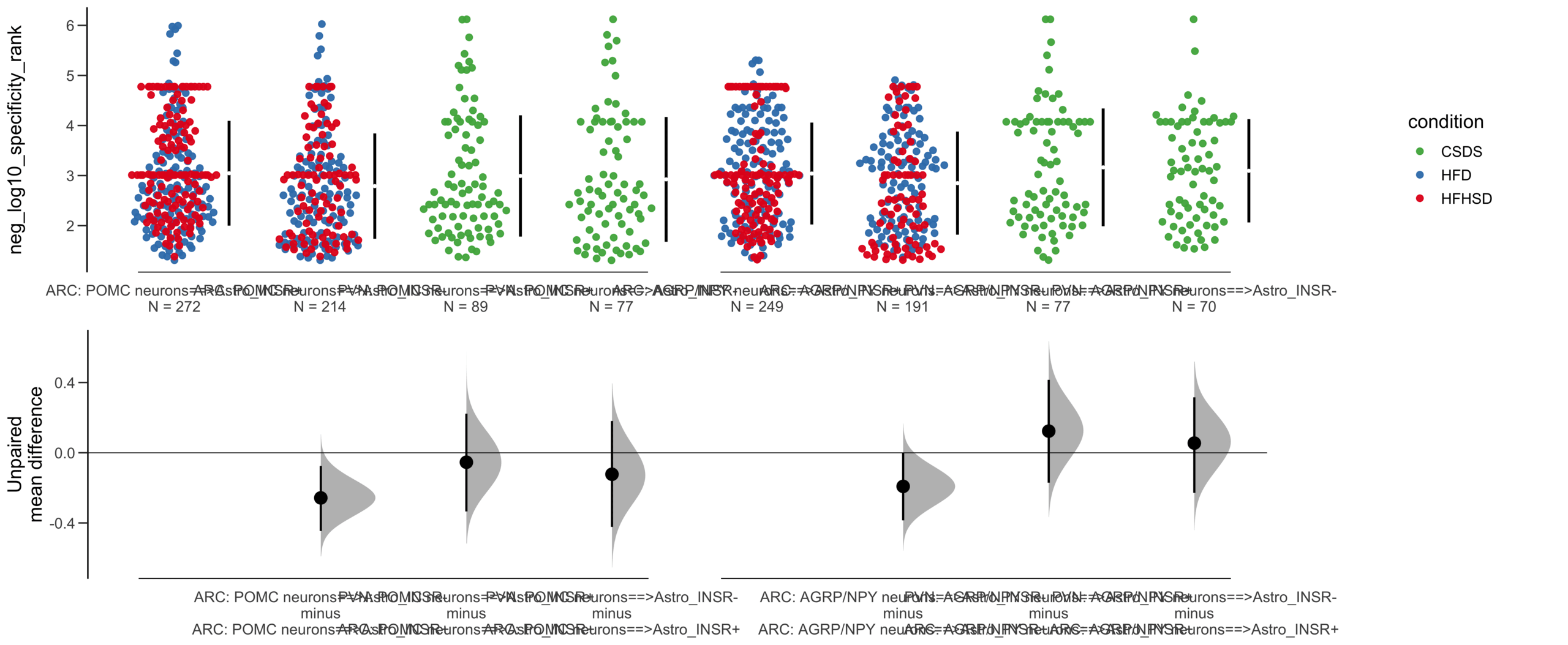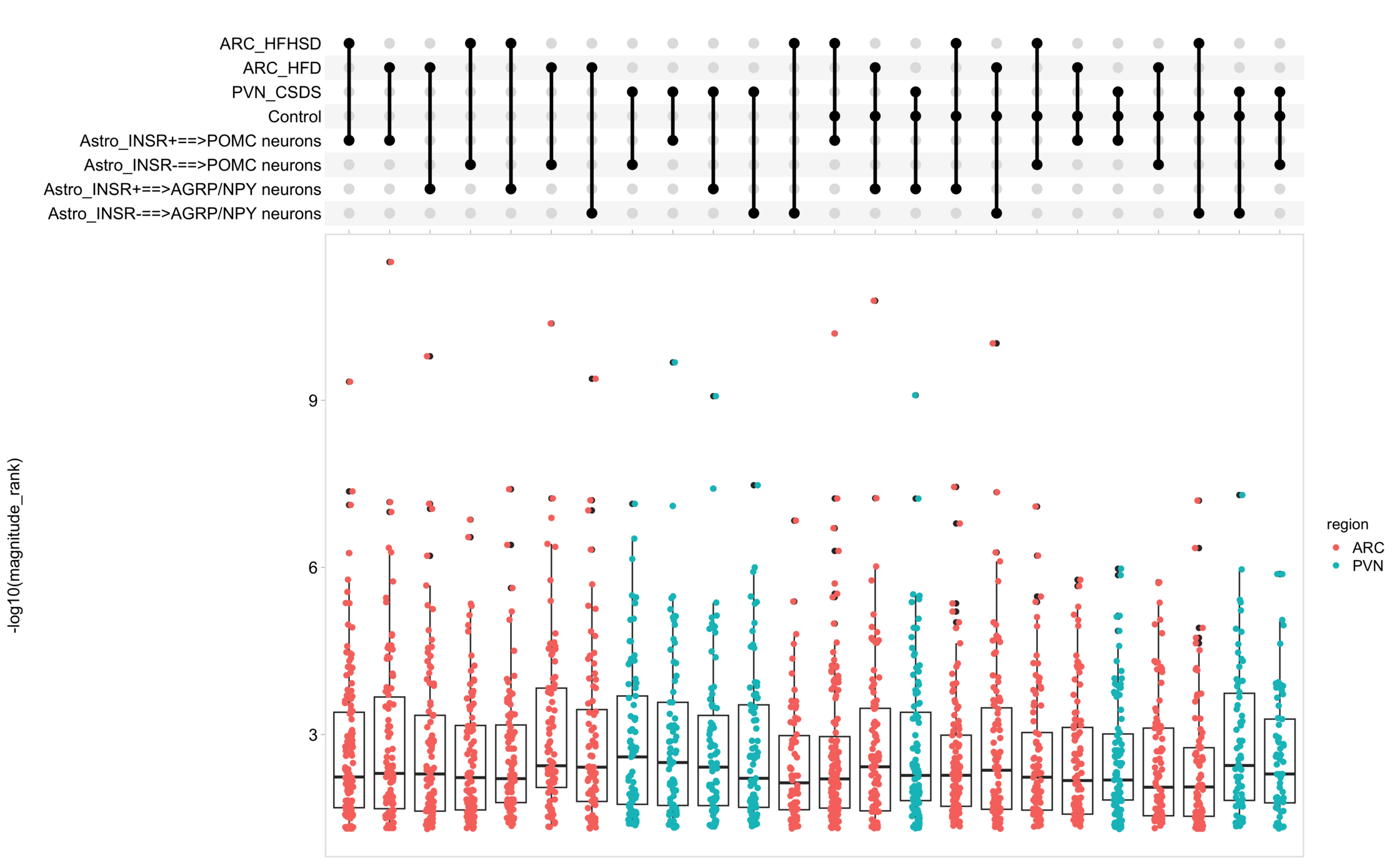 plr <-ggplot(df, aes(x = pairs, y = neg_log10_specificity_rank, color =as.factor(control), size = neg_log10_magnitude_rank)) +geom_jitter(width =0.1) +geom_line(aes(group = lr_complex), linetype ="solid", alpha =0.2) +theme_minimal() +theme(axis.text.x =element_text(angle =90, vjust =0.5, hjust =1)) +facet_wrap(~control)# Add text labels for min and max 5 values within each group using ggrepelplr <- plr +geom_text_repel(data = top_bot_10 %>%filter(pairs =="Astro_INSR+==>POMC neurons"),aes(label = lr_complex,point.size = neg_log10_magnitude_rank ), # data point sizenudge_x =0.2, direction ="y", hjust ="left",size =6, # font size in the text labelspoint.padding =0, # additional padding around each pointmin.segment.length =0, # draw all line segmentsmax.time =5, max.iter =1e6, # stop after 1 second, or after 100,000 iterationsseed = reseed,max.overlaps =Inf,box.padding =0.5) +geom_text_repel(data = top_bot_10 %>%filter(pairs =="Astro_INSR-==>POMC neurons"),aes(label = lr_complex,point.size = neg_log10_magnitude_rank ), # data point sizenudge_x =-.2, direction ="y", hjust ="right",size =6, # font size in the text labelspoint.padding =0, # additional padding around each pointmin.segment.length =0, # draw all line segmentsmax.time =5, max.iter =1e6, # stop after 1 second, or after 100,000 iterationsseed = reseed,max.overlaps =Inf,box.padding =0.5)print(plr)