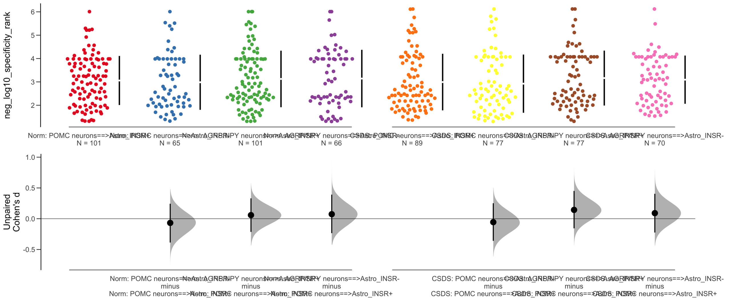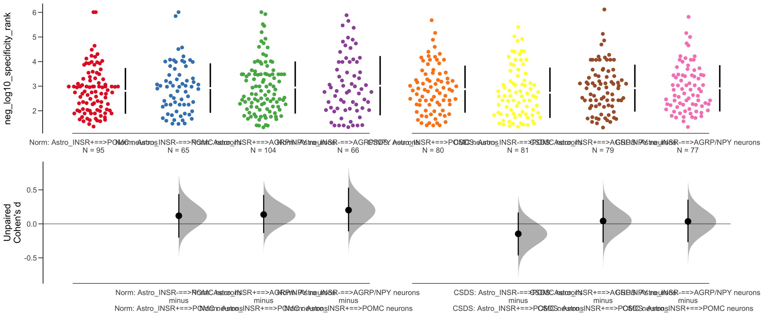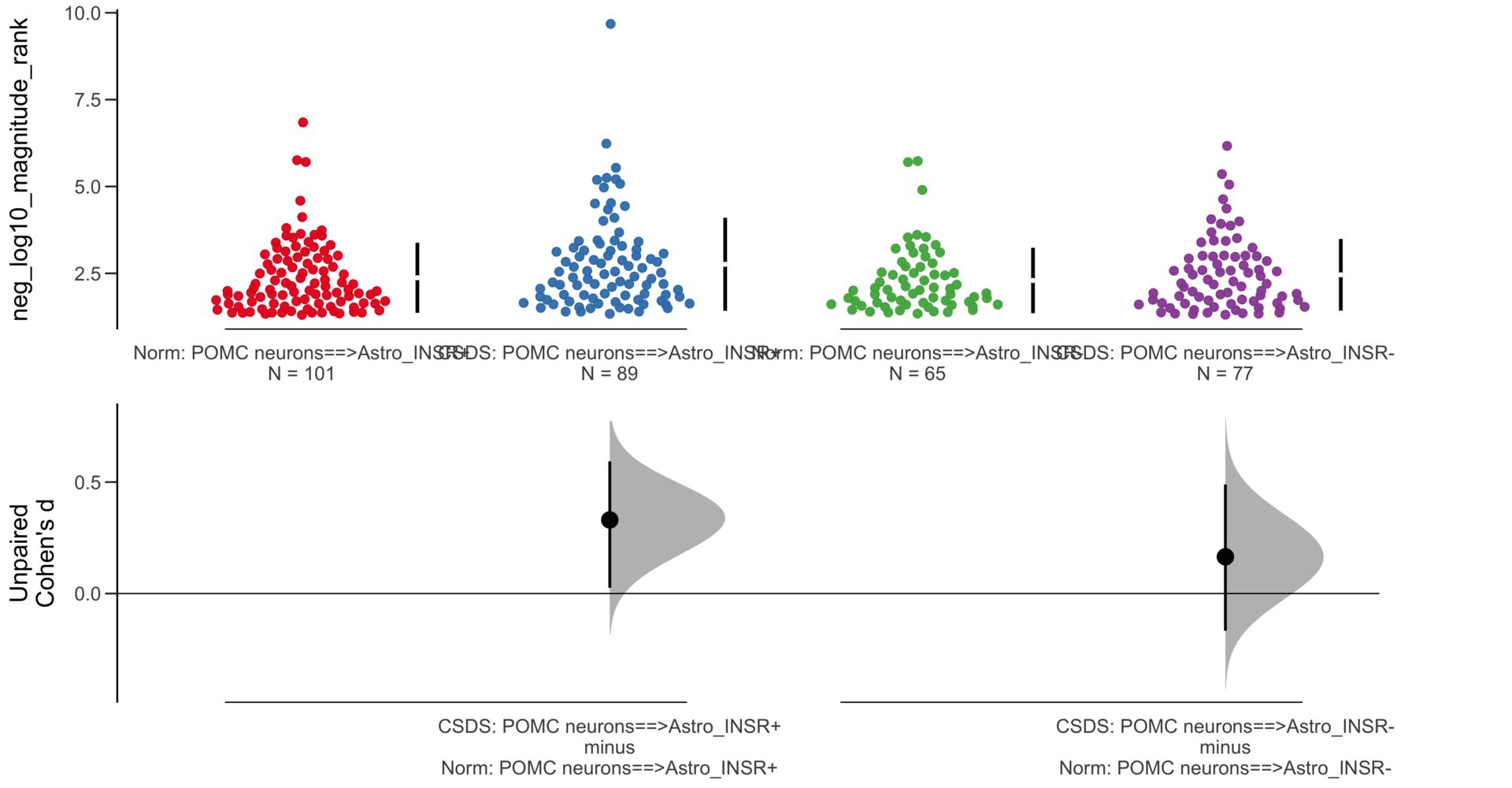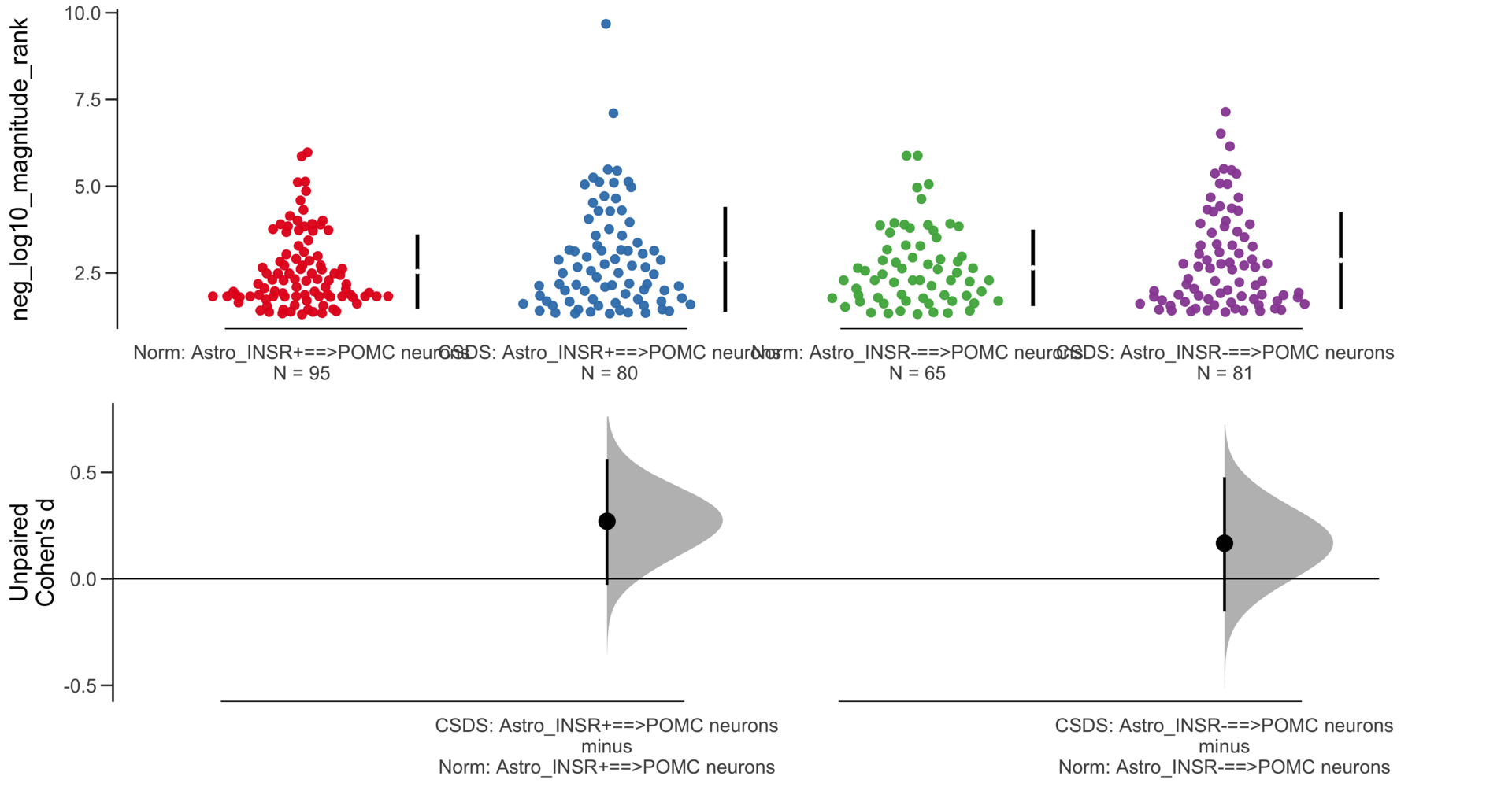 Unpaired Cohen's d of POMC neurons==>Astro_INSR- (n = 142) minus POMC neurons==>Astro_INSR+ (n = 190)