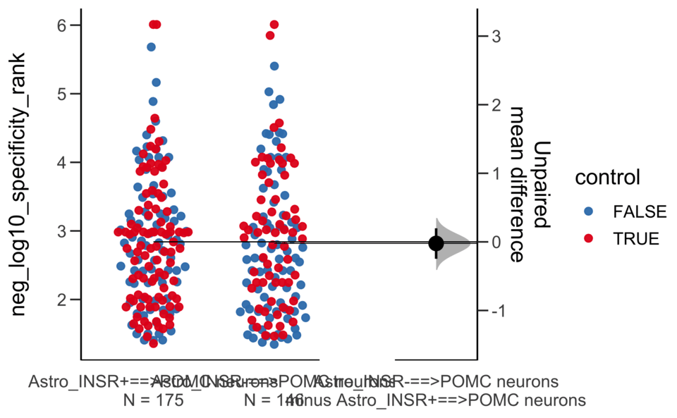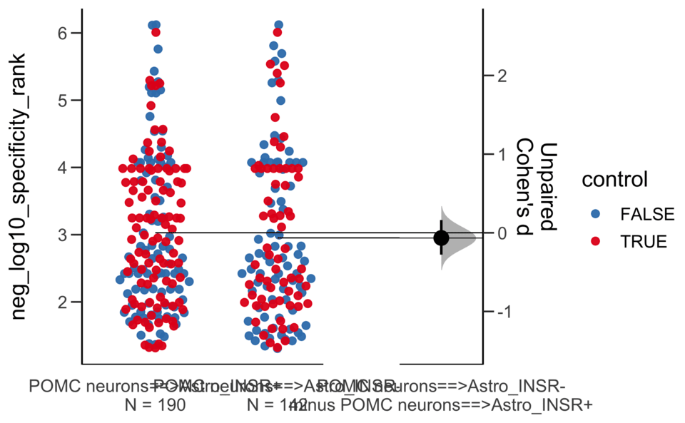 pr <-ggplot(df, aes(x = pairs, y = neg_log10_specificity_rank, color =as.factor(control), size = neg_log10_magnitude_rank)) +geom_jitter(width =0.1) +geom_line(aes(group = lr_complex), linetype ="solid", alpha =0.2) +theme_minimal() +theme(axis.text.x =element_text(angle =90, vjust =0.5, hjust =1)) +facet_wrap(~control)# Add text labels for min and max 5 values within each group using ggrepelpr <- pr +geom_text_repel(data = top_bot_10 %>%filter(pairs =="Astro_INSR+==>POMC neurons"),aes(label = receptor_complex,point.size = neg_log10_magnitude_rank ), # data point sizenudge_x =0.2, direction ="y", hjust ="left",size =6, # font size in the text labelspoint.padding =0, # additional padding around each pointmin.segment.length =0, # draw all line segmentsmax.time =5, max.iter =1e6, # stop after 1 second, or after 100,000 iterationsseed = reseed,max.overlaps =Inf,box.padding =0.5) +geom_text_repel(data = top_bot_10 %>%filter(pairs =="Astro_INSR-==>POMC neurons"),aes(label = receptor_complex,point.size = neg_log10_magnitude_rank ), # data point sizenudge_x =-.2, direction ="y", hjust ="right",size =6, # font size in the text labelspoint.padding =0, # additional padding around each pointmin.segment.length =0, # draw all line segmentsmax.time =5, max.iter =1e6, # stop after 1 second, or after 100,000 iterationsseed = reseed,max.overlaps =Inf,box.padding =0.5)print(pr)